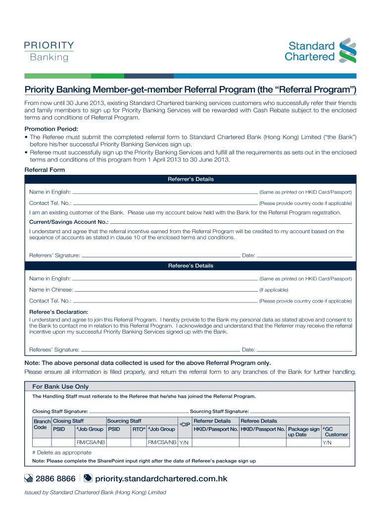 Priority Banking Membergetmember Referral Program (the Referral Program) From now until 30 June 2013, existing Standard Chartered banking services customers who successfully refer their friends and
