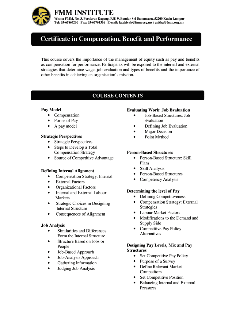 FMM INSTITUTE Wilma FMM, No. 3, Persia ran Dag ang, PJ 9, Band Sri Mansard, 52200 Kuala Lumpur Tel: 0362867200 Fax: 0362761316 Email: Aaliyah FMM.org.my / Anita FMM.org.my Certificate in Compensation,