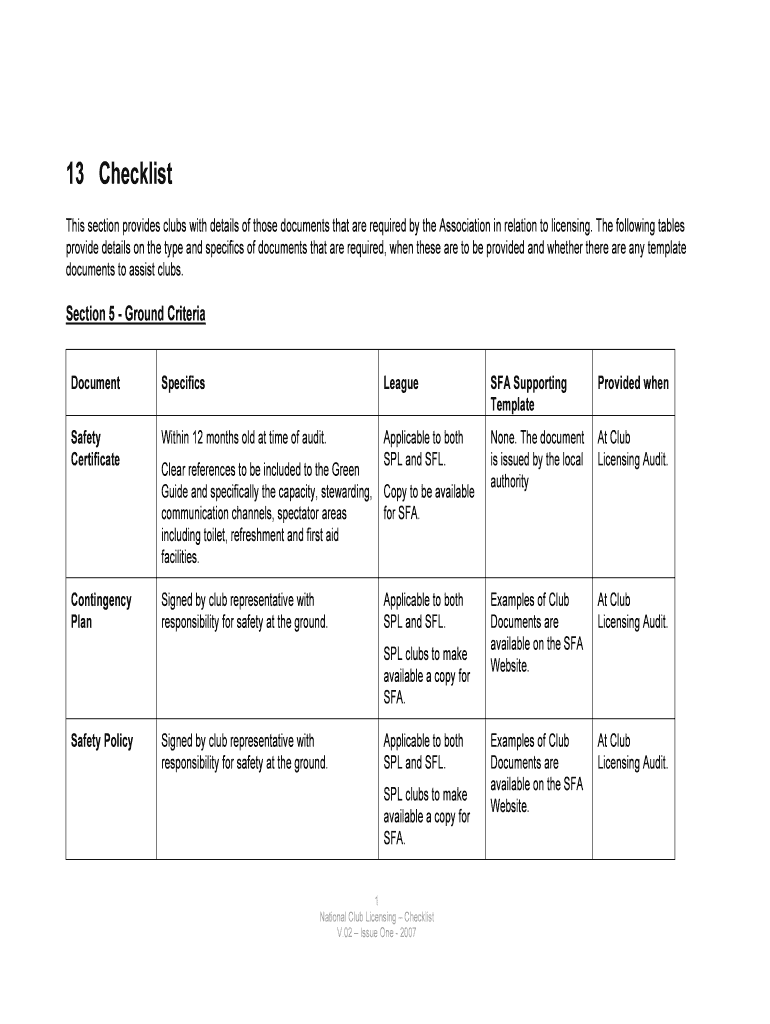 13 Checklists This section provides clubs with details of those documents that are required by the Association in relation to licensing. The following tables provide details on the type and specifics