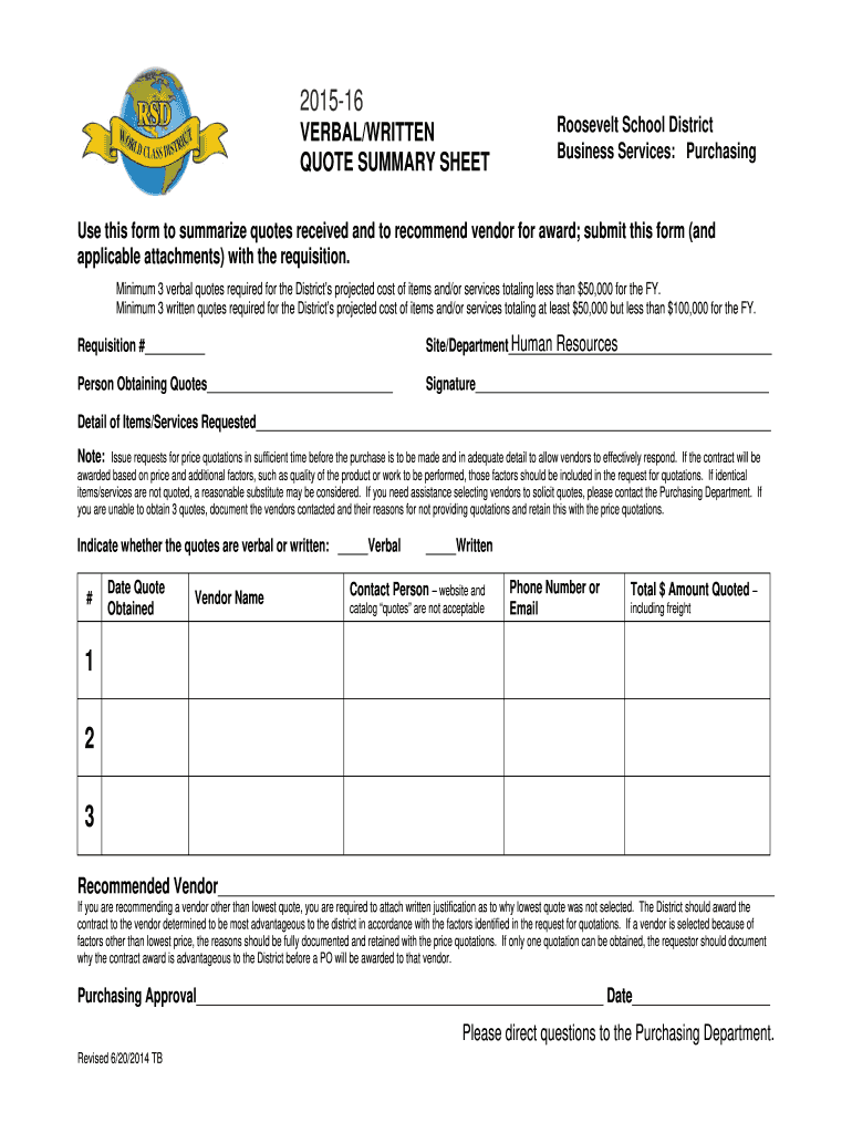 Get the free verbal/written quote summary sheet - Roosevelt School District