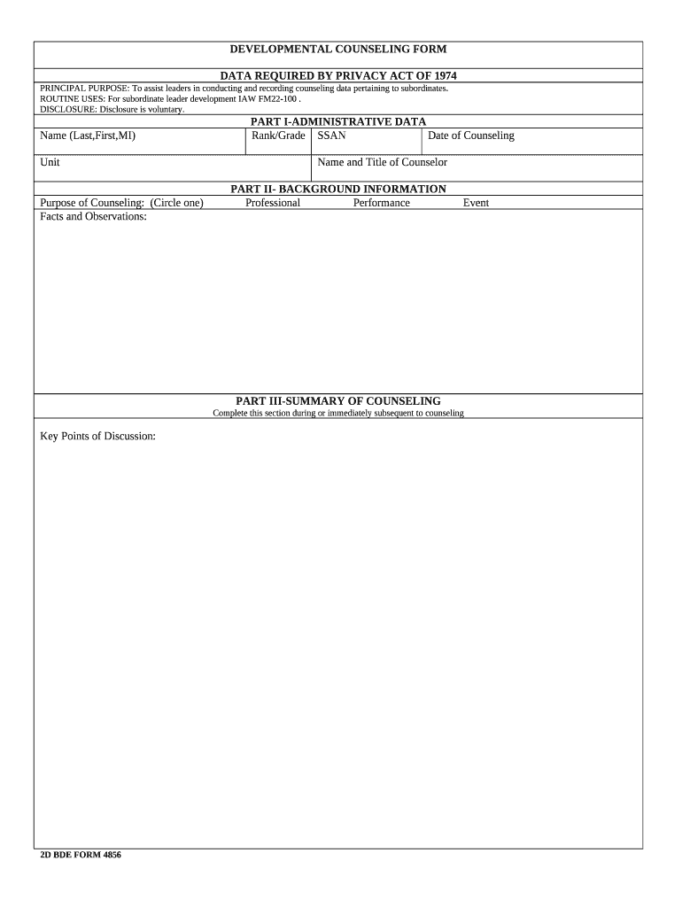 PRINCIPAL PURPOSE: To assist leaders in conducting and recording counseling data pertaining to subordinates.