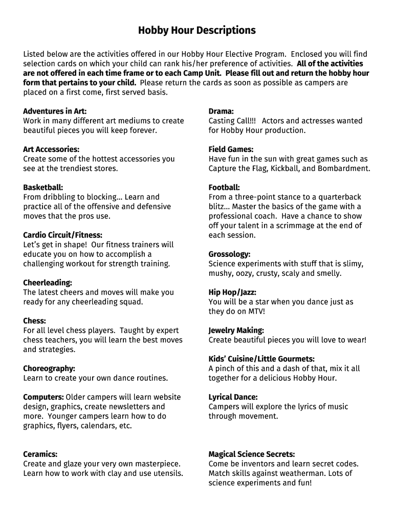 Listed below are the activities offered in our Hobby Hour Elective Program. Enclosed you will find