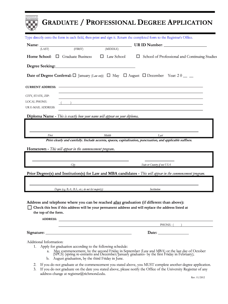 The Graduate Professional Degree Application is a college application form used by students to apply for graduation from a graduate or professional degree program.