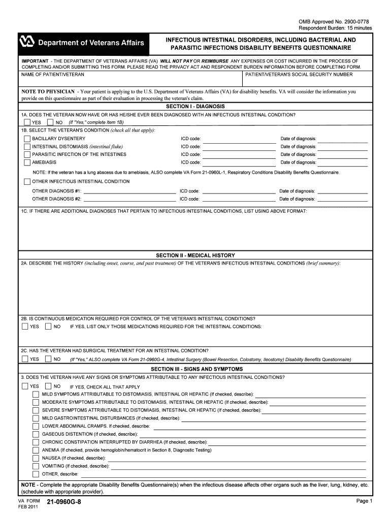 The VA Form 21-0960G-8 serves as a critical tool in the evaluation of disability benefits for veterans. This questionnaire is specifically designed to collect detailed information about a veteran's experience with infectious intestinal disorders. By utilizing the VA Form 21-0960G-8, physicians can accurately convey the necessary medical data to the U.S. Department of Veterans Affairs (VA) to assist in the claims process.