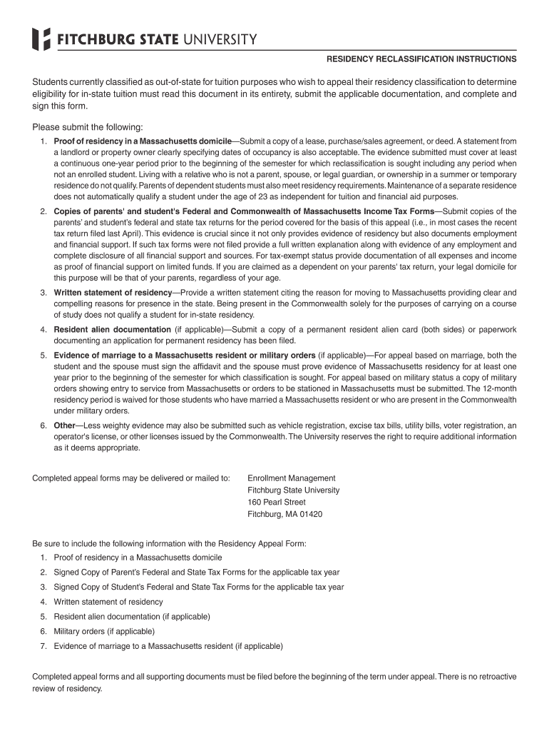 The Residency Reclassification Form is a document used by students at Fitchburg State University to appeal their out-of-state tuition classification and determine eligibility for in-state tuition.