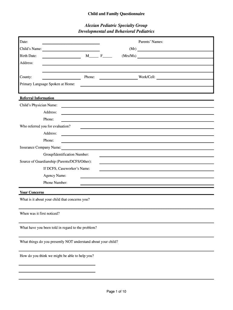 The Child and Family Questionnaire is a medical history form used by pediatric specialists to gather comprehensive information about a child's health, development, and behavior.