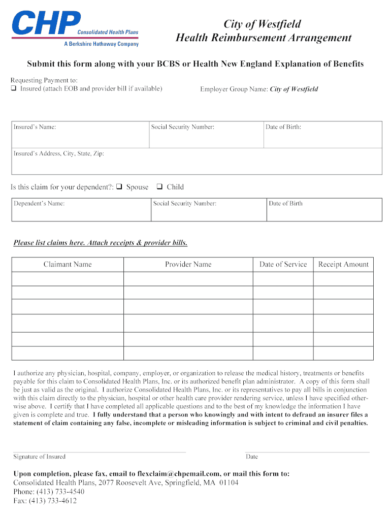 City of Westfield Health Reimbursement Arrangement Submit this form along with your BCBS or Health New England Explanation of Benefits Requesting Payment to: ? Insured (attach EOB and provider bill