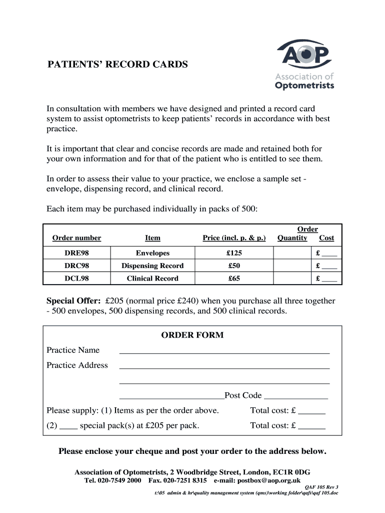 The Patients' Record Cards Order Form is a healthcare document used by optometrists to order record cards for maintaining patient records.