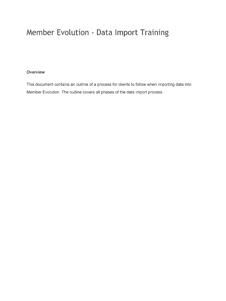 Member Evolution Data Import TrainingOverview Thisdocumentcontainsanoutlineofaprocessforclientstofollowwhenimportingdatainto MemberEvolution. Theoutlinecoversallphasesofthedataimportprocess.1. Basics