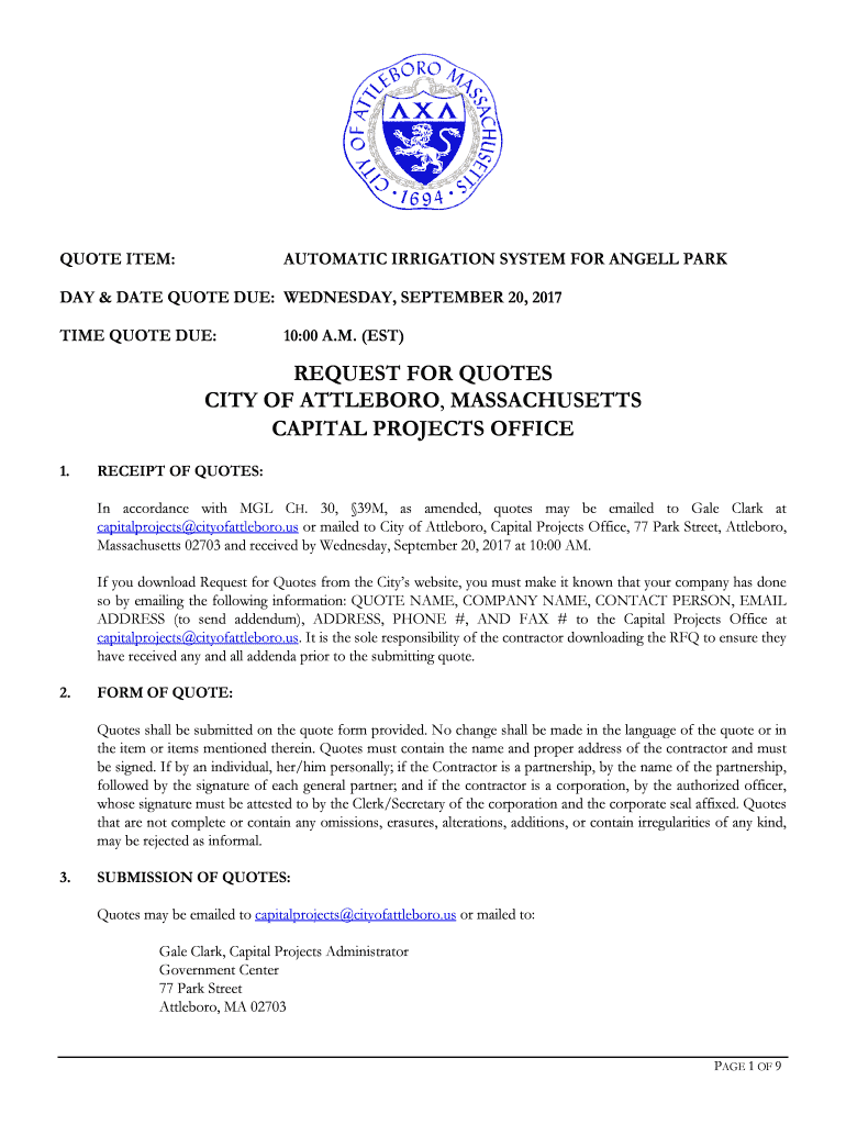 QUOTE ITEM:AUTOMATIC IRRIGATION SYSTEM FOR ANGEL PARKWAY & DATE QUOTE DUE: WEDNESDAY, SEPTEMBER 20, 2017, TIME QUOTE DUE:10:00 A.M. (EST)REQUEST FOR QUOTES CITY OF ATTLEBORO, MASSACHUSETTS CAPITAL