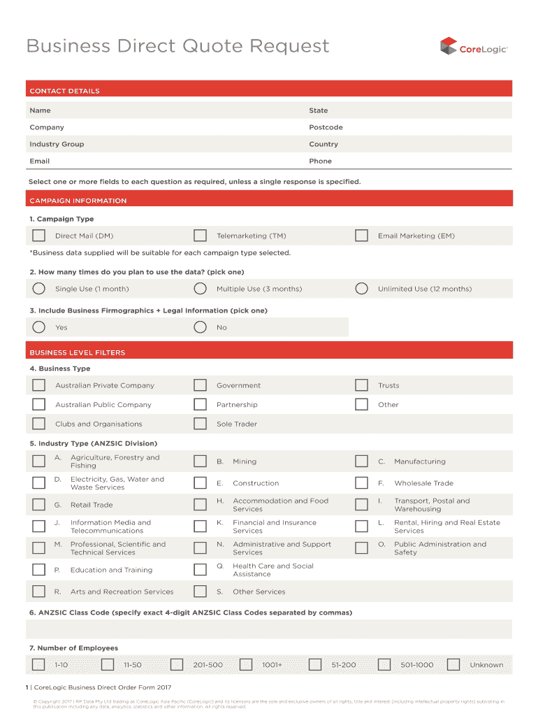 NameStateCompanyPostcodeIndustry GroupCountryEmailPhoneSelect one or more fields to each question as required, unless a single response is specified.