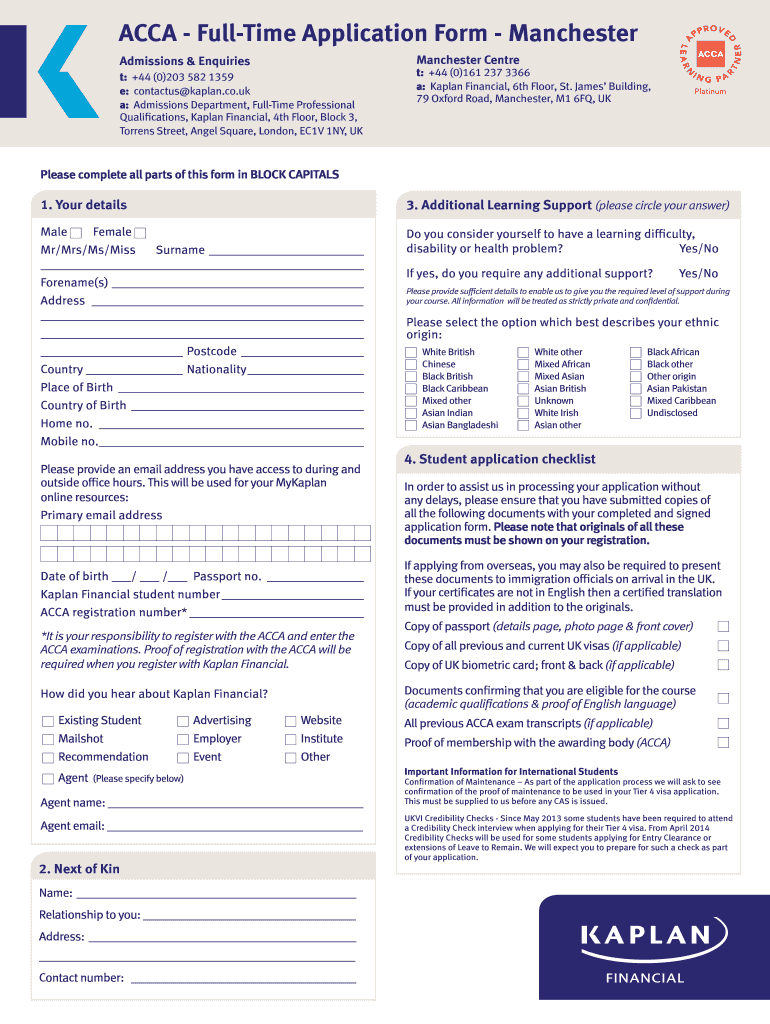 CCA Full-Time Application For — Manchester Center Admissions & Inquiries t: +44 (0)203 582 1359 e: contacts Kaplan.co.UK a: Admissions Department, Full-Time Professional Qualifications, Kaplan Financial,