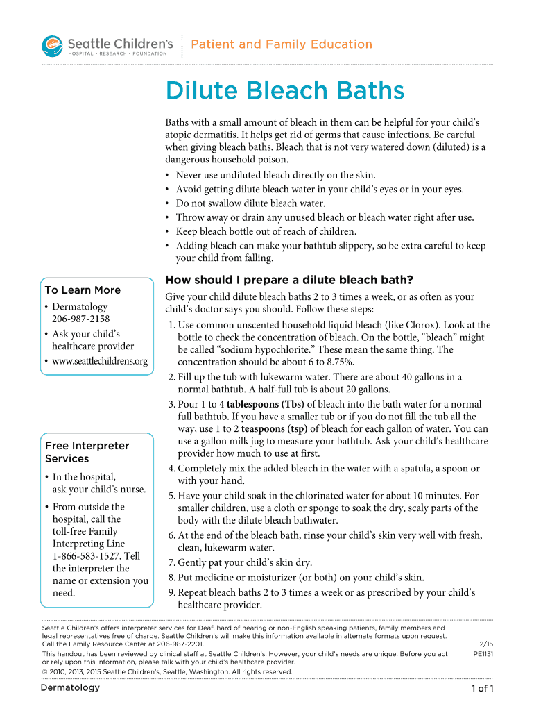 Patient and Family EducationDilute Bleach Baths with a small amount of bleach in them can be helpful for your children atomic dermatitis. It helps get rid of germs that cause infections. Be careful