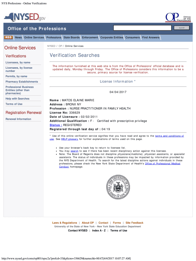 Get the free NYS Professions - Online Verifications