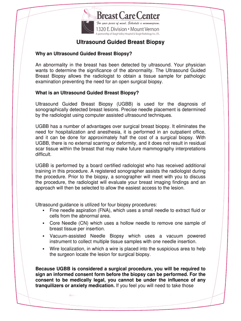 Patients who have suspicious findings on a mammogram or ultrasound may be required to undergo ultrasound guided breast biopsy.