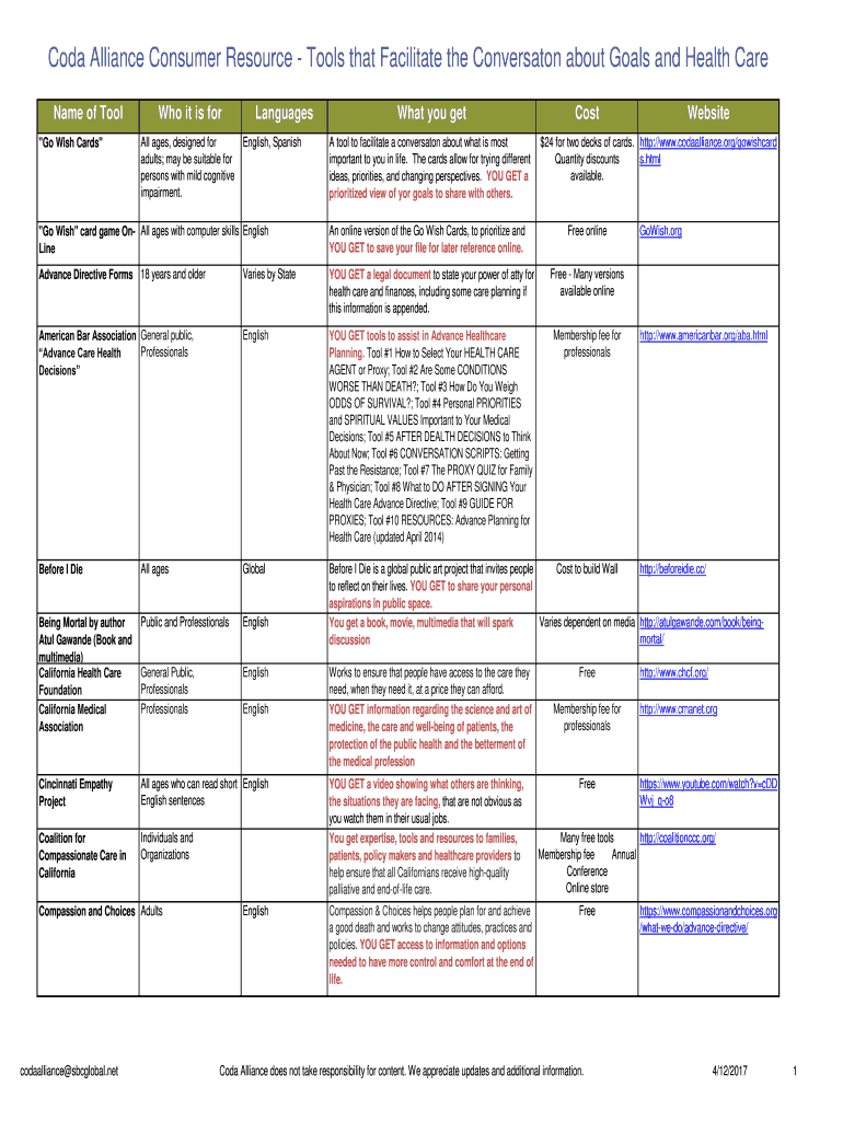 Coda Alliance Consumer Resource Tools that Facilitate the Conversation about Goals and Health Care Name of Tool “Go Wish Cards “Who it is for All ages, designed for adults; may be suitable for