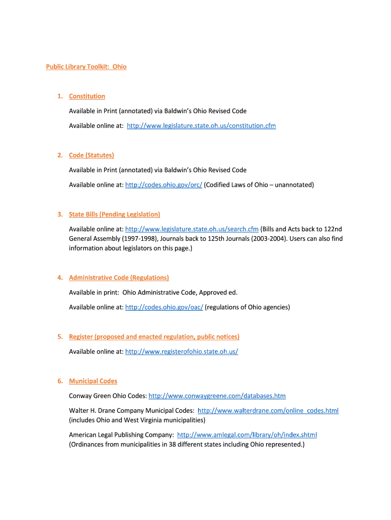 Public Library Toolkit: Ohio1. Constitution Available in Print (annotated) via Baldwins Ohio Revised Code Available online at: http://www.legislature.state.oh.us/constitution.cfm2. Code (Statutes)