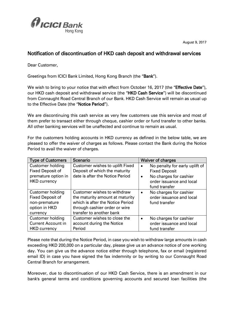 Get the free Notification of discontinuation of HKD cash deposit and withdrawal services