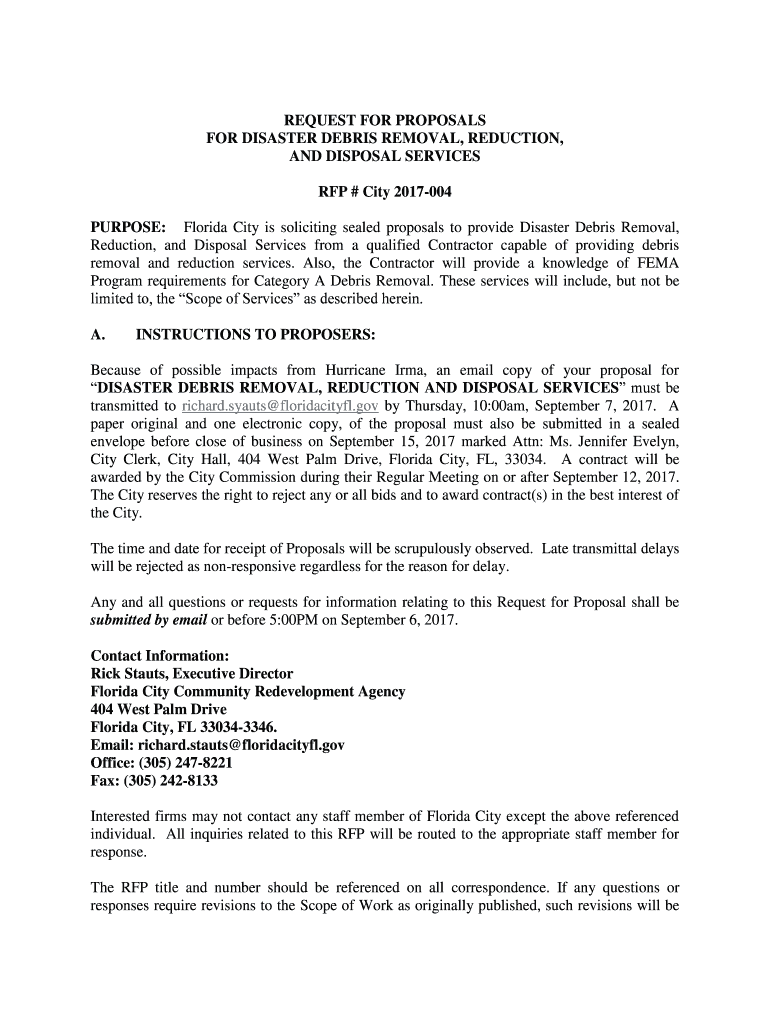 PURPOSE: Florida City is soliciting sealed proposals to provide Disaster Debris Removal,