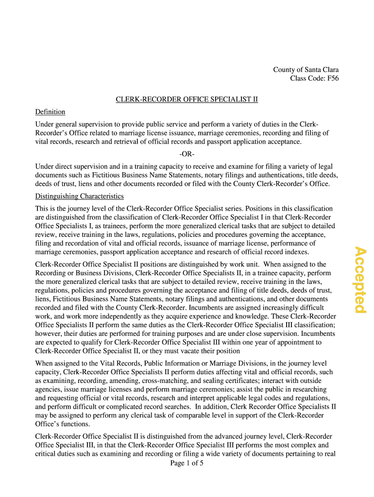 Under general supervision to provide public service and perform a variety of duties in the ClerkRecorders Office