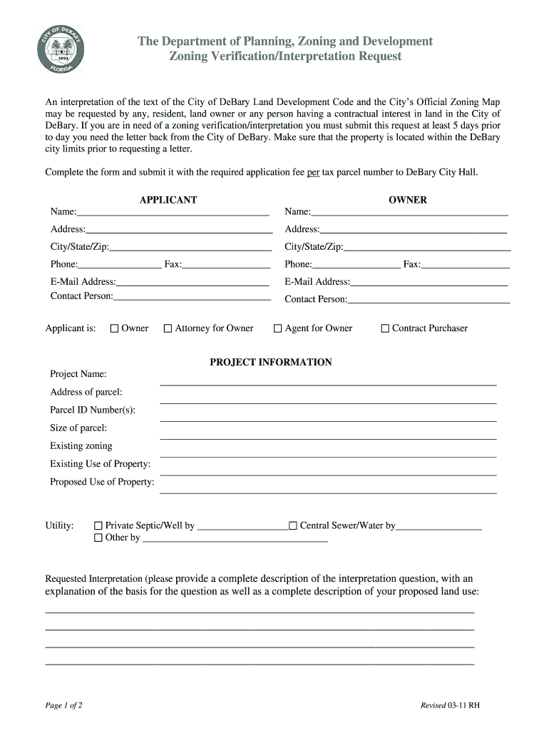 The Department of Planning, Zoning and Development Zoning Verification/Interpretation Request An interpretation of the text of the City of Debark Land Development Code and the City s Official Zoning