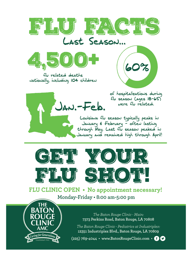 4,500+Get Your Flu Shot!FLU CLINIC OPEN No appointment necessary! Monday Friday 8:00 am5:00 the Baton Rouge Clinic Main: 7373 Perkins Road, Baton Rouge, LA 70808 The Baton Rouge Clinic Pediatrics