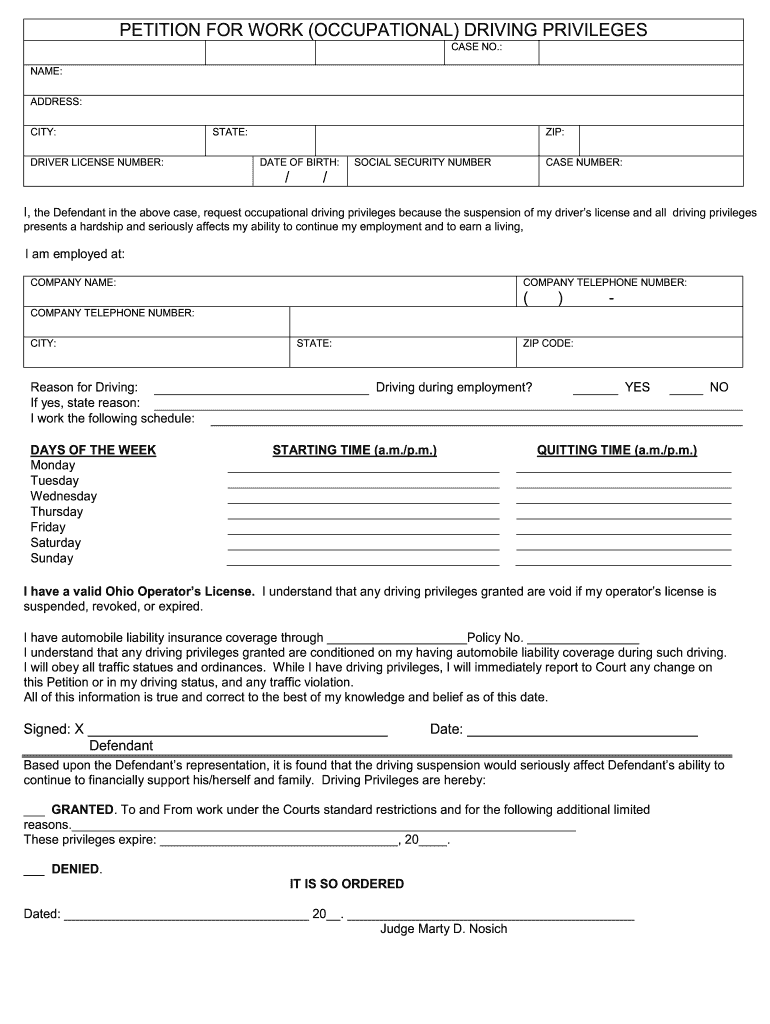 The Petition for Occupational Driving Privileges is a legal document used by defendants in Ohio to request temporary driving privileges during a license suspension due to hardship.