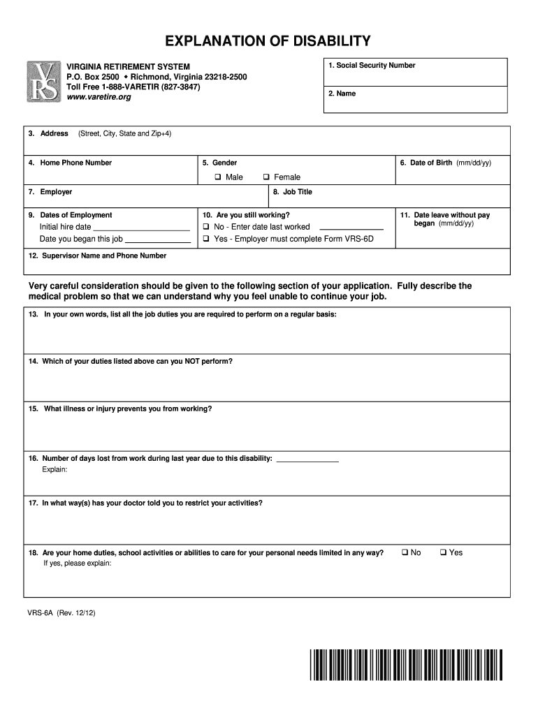 The Virginia Disability Retirement Explanation Form, also known as the VRS-6A form, plays a crucial role within the Virginia Retirement System. This form is designed for members to articulate their disability status and how it impacts their eligibility for retirement benefits. Explaining one's disability accurately is vital, as it directly influences the benefits members may receive under the Virginia disability retirement program.