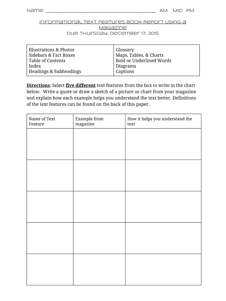 Name: AM MID PM Informational Text Features Book Report Using a Magazine Due Thursday, December 17, 2015Illustrations & Photos Sidebars & Fact Boxes Table of Contents Index Headings & SubheadingsGlossary