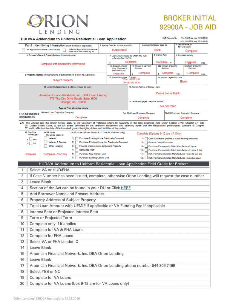 BROKER INITIAL 92900A JOB AID HUD/VA Addendum to Uniform Residential Loan Application Field Guide for Brokers 1Select VA or HUD/FHA2If Case Number has been issued, complete, otherwise Orion Lending