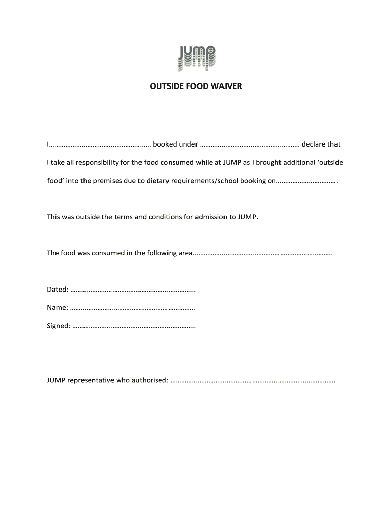 This document serves as a waiver for individuals bringing outside food into JUMP, acknowledging responsibility for the food consumed due to dietary requirements or school booking.