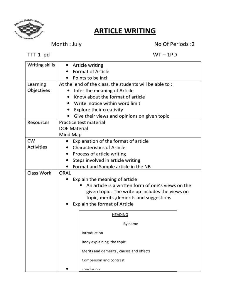 ARTICLE WRITING Month : July No Of Periods :2TTT 1 pd Writing skillsLearning ObjectivesResourcesCW ActivitiesClass Work 1PD Article writing Format of Article Points to be incl At the end of the class,