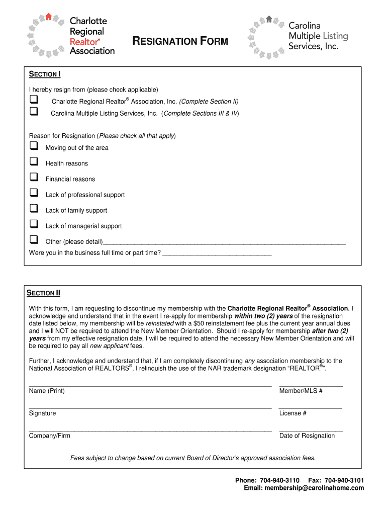 RESIGNATION FORM SECTION I hereby resign from (please check applicable) Charlotte Regional Realtor Association, Inc. (Complete Section II) Carolina Multiple Listing Services, Inc. (Complete Sections