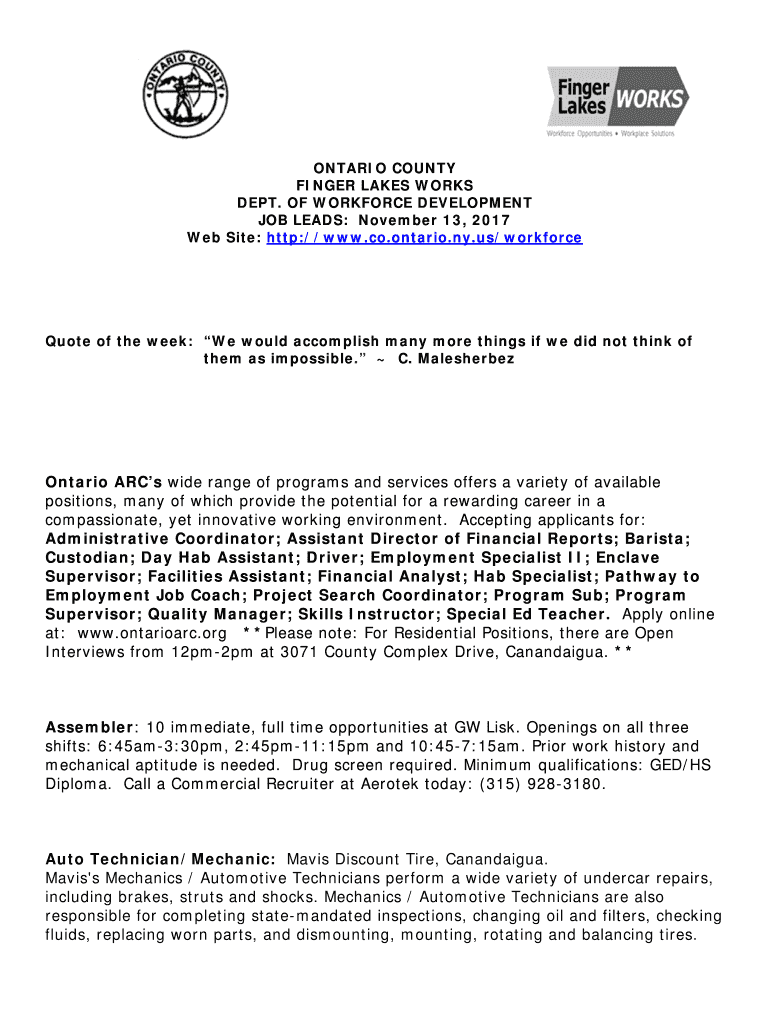 ONTARIO COUNTY FINGER LAKES WORKS DEPT. OF WORKFORCE DEVELOPMENT JOB LEADS: November 13, 2017, Website: http://www.co.ontario.ny.us/workforceQuote of the week: We would accomplish many more things
