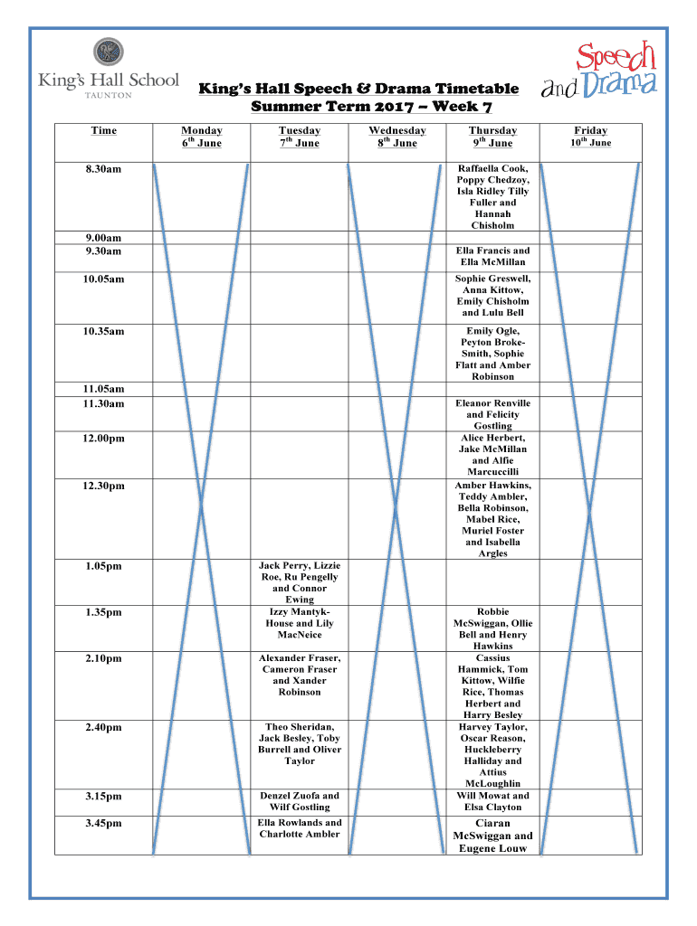 Kings Hall Speech & Drama Timetable Summer Term 2017 Week 7 Time Monday 6th June Tuesday 7th June8.30amWednesday 8th June Thursday 9th June Raffaello Cook, Poppy Cherry, Islam Ridley Tilly Fuller