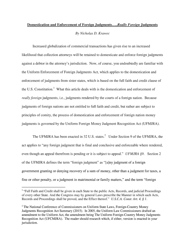 Domestication and Enforcement of Foreign Judgments. Really Foreign Judgments