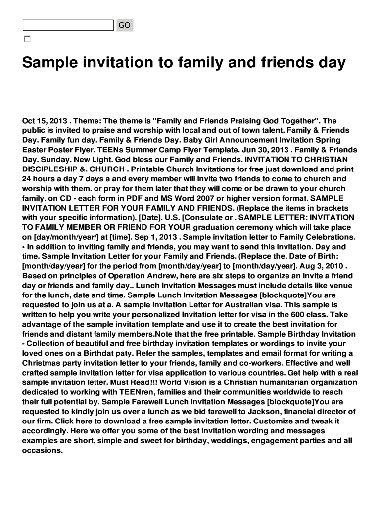 Sample invitation to family and friends day Oct 15, 2013. Theme: The theme is “Family and Friends Praising God Together “. The public is invited to praise and worship with local and out of town