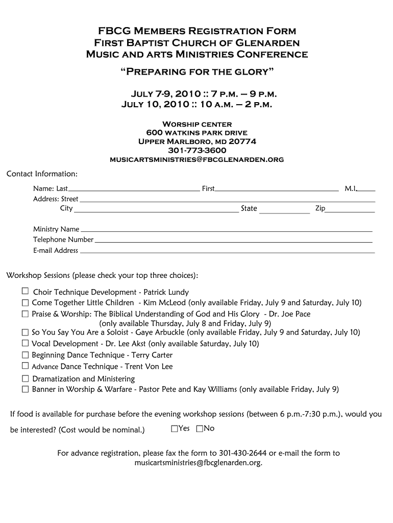 BCG Members Registration Form First Baptist Church of Garden Music and arts Ministries Conference Preparing for the glory July 79, 2010 :: 7 p.m. 9 p.m. July 10, 2010 :: 10 a.m. 2 p.m. Worship center