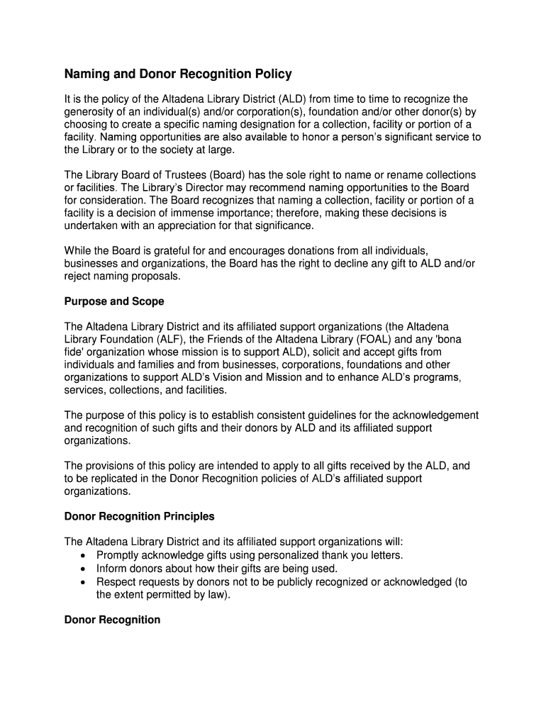Get the free Naming and Donor Recognition Policy