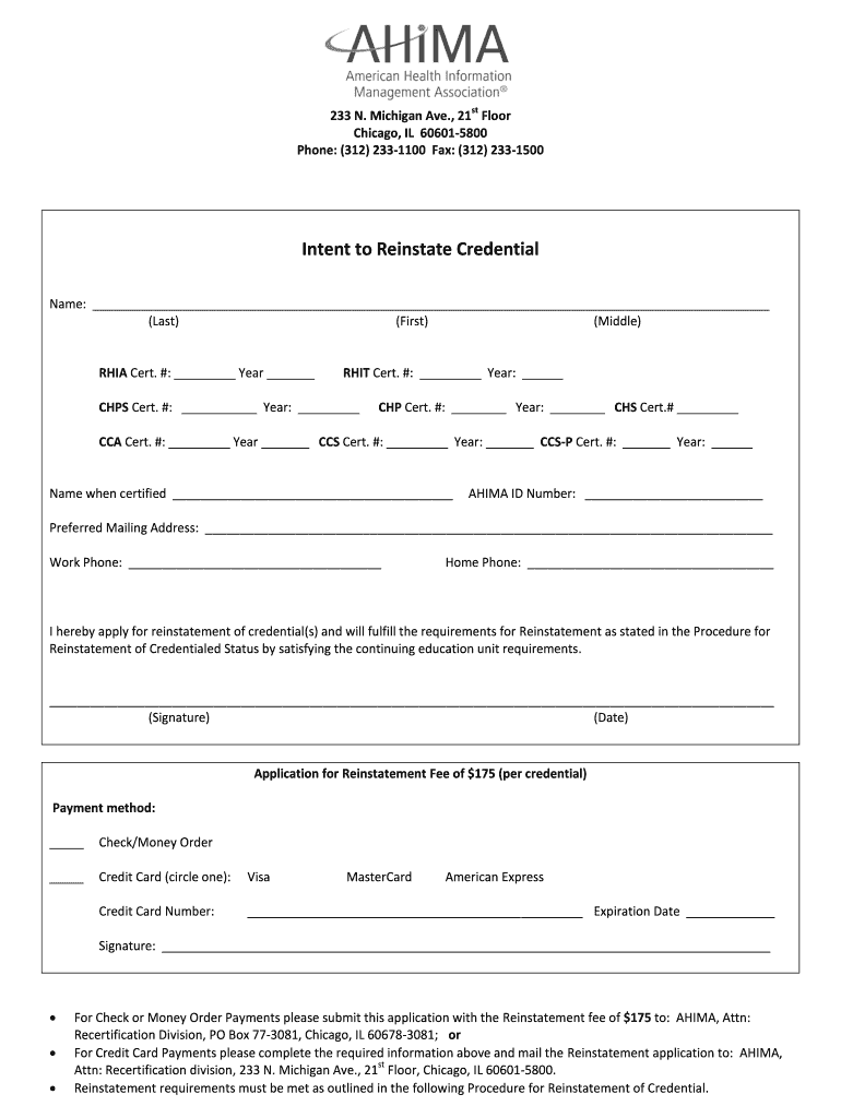 There is a reinstatement fee required for processing the Intent to Reinstate Credential form. The specific amount can vary, so check with the American Health Information Management Association (AHIMA) for the current fee structure.