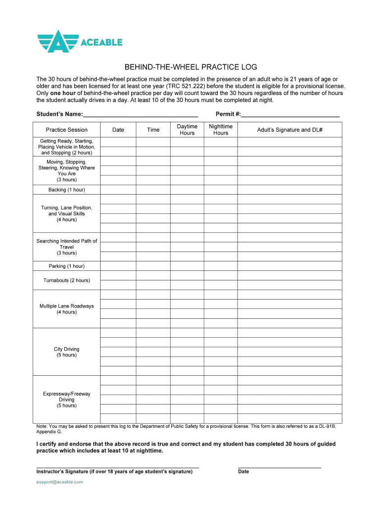 BEHINDTHEWHEEL PRACTICE LOG The 30 hours of behindthewheel practice must be completed in the presence of an adult who is 21 years of age or older and has been licensed for at least one year (TRC 521.222)