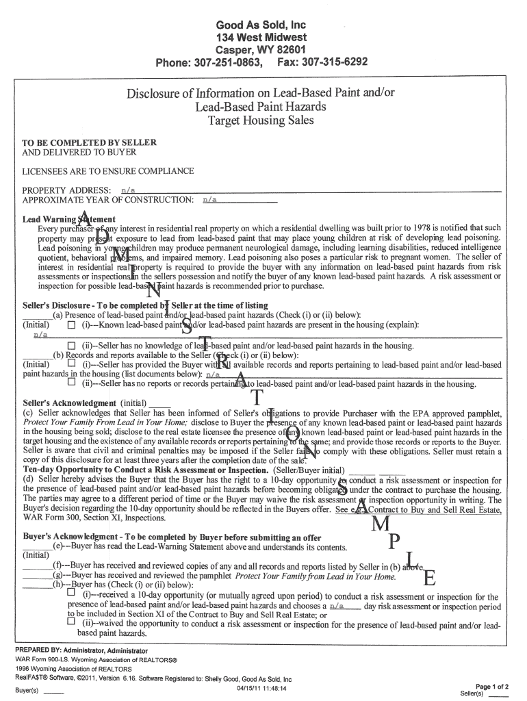 Complete relevant fields, checking for the presence of lead-based paint and any records available to the Seller.