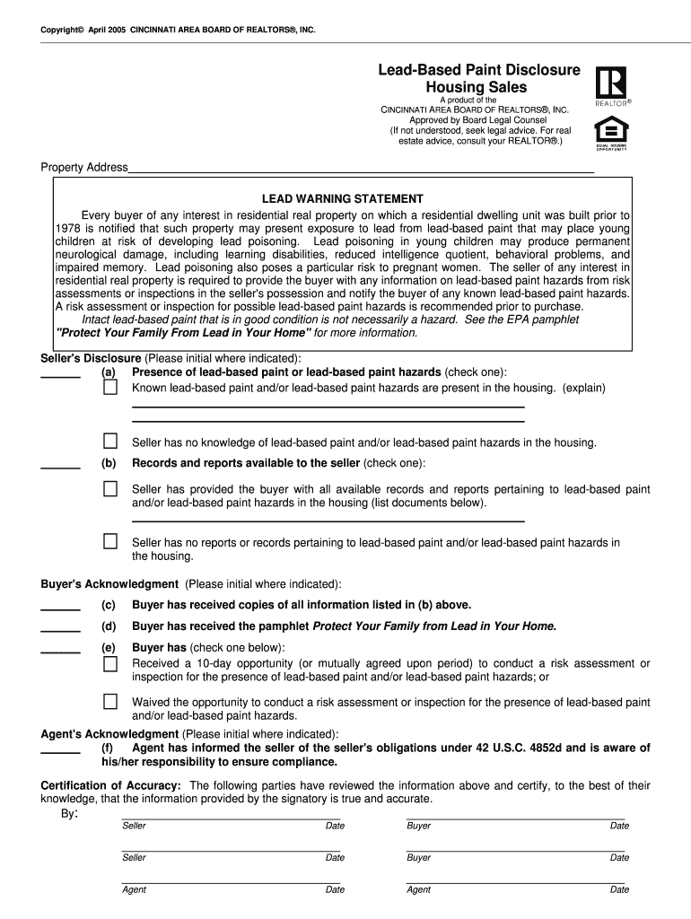 Copyright April 2005 CINCINNATI AREA BOARD OF REALTORS, INC. Leased Paint Disclosure Housing Sales A product of the CINCINNATI AREA BOARD OF REALTORS, INC. Approved by Board Legal Counsel (If not