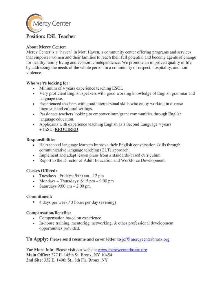 Position: ESL Teacher About Mercy Center: Mercy Center is a “haven in Mott Haven, a community center offering programs and services that empower women and their families to reach their full potential