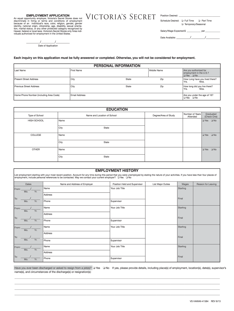 The Victoria’s Secret Employment Application Form is a document used by job seekers to apply for positions at Victoria’s Secret Stores in Hawaii.