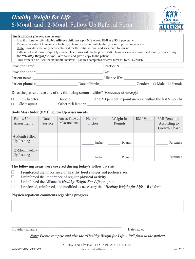 The Healthy Weight for Life Follow Up Referral Form is for healthcare providers referring Alliance children aged 2-18 with a BMI at or above the 85th percentile for follow-up care.