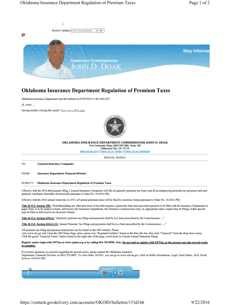 Oklahoma Insurance Department Regulation of Premium Taxes Page 1 of 22 Receive UpdatesGoOklahoma Insurance Department Regulation of Premium Taxes Oklahoma Insurance Department sent this bulletin at