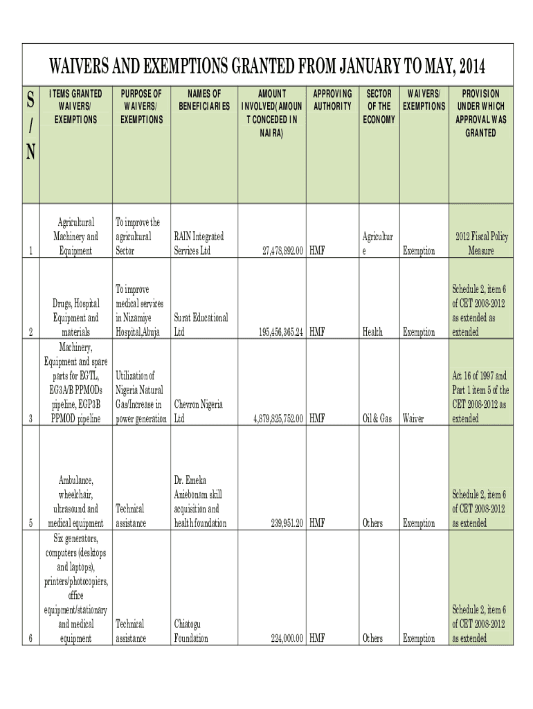 WAIVERS AND EXEMPTIONS GRANTED FROM JANUARY TO MAY 2014