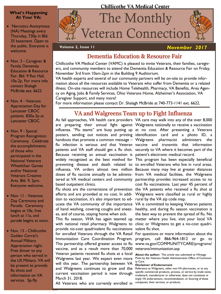 Chillicothe VA Medical Center What's Happening At Your VA: Narcotics Anonymous (NA) Meetings every Thursday, 730p in BLD. 35 basements. Open to the public. Everyone is welcome. Nov. 3 Caregiver &