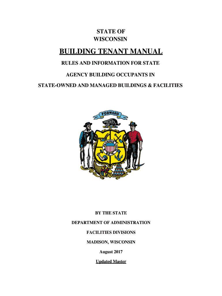 STATE OF WISCONSINBUILDING TENANT MANUAL RULES AND INFORMATION FOR STATE AGENCY BUILDING OCCUPANTS IN STATE-OWNED AND MANAGED BUILDINGS & FACILITIES THE STATE DEPARTMENT OF ADMINISTRATION FACILITIES
